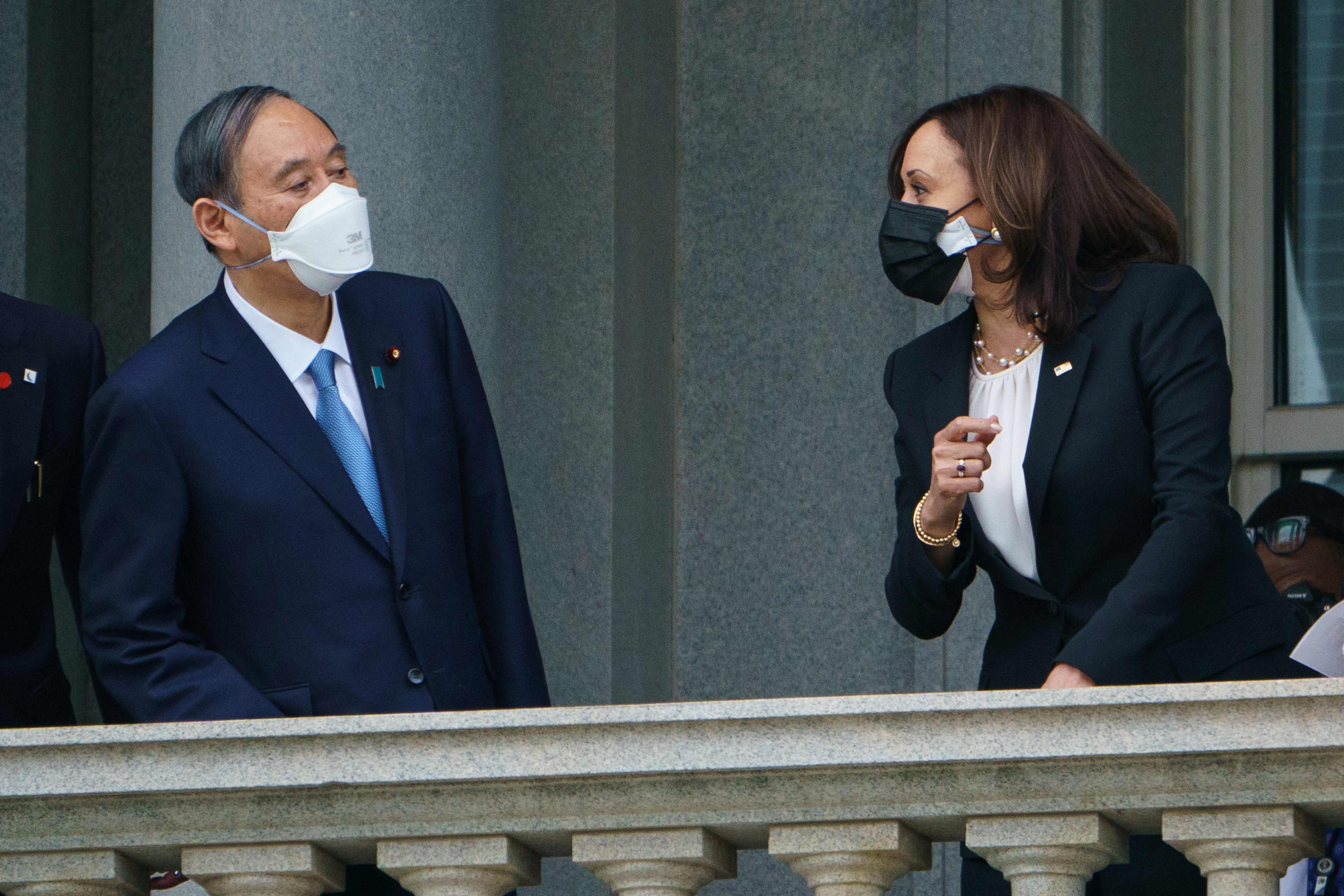 US Vice-President Kamala Harris (right) hosts Japanese Prime Minister Yoshihide Suga ahead of a bilateral meeting in Washington.