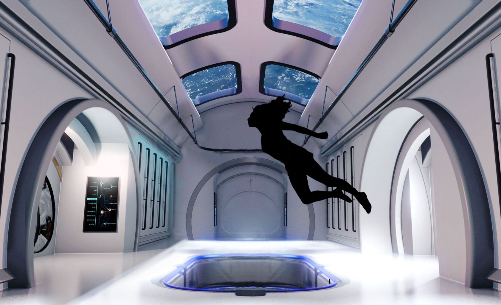 It will support 10 people in a volume of 830 cubic metres (30,000 cubic feet), which is slightly smaller than the ISS, in futuristic modules with huge windows.