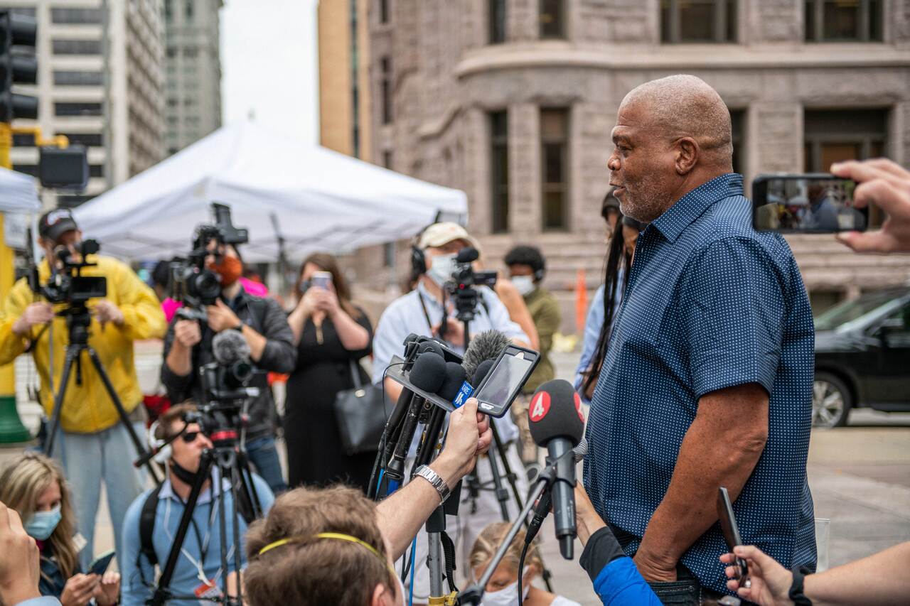 Selwyn Jones, uncle of George Floyd, speaks with reporters in front of the Hennepin County Public Safety Facility in Minneapolis on June 29, 2020.
