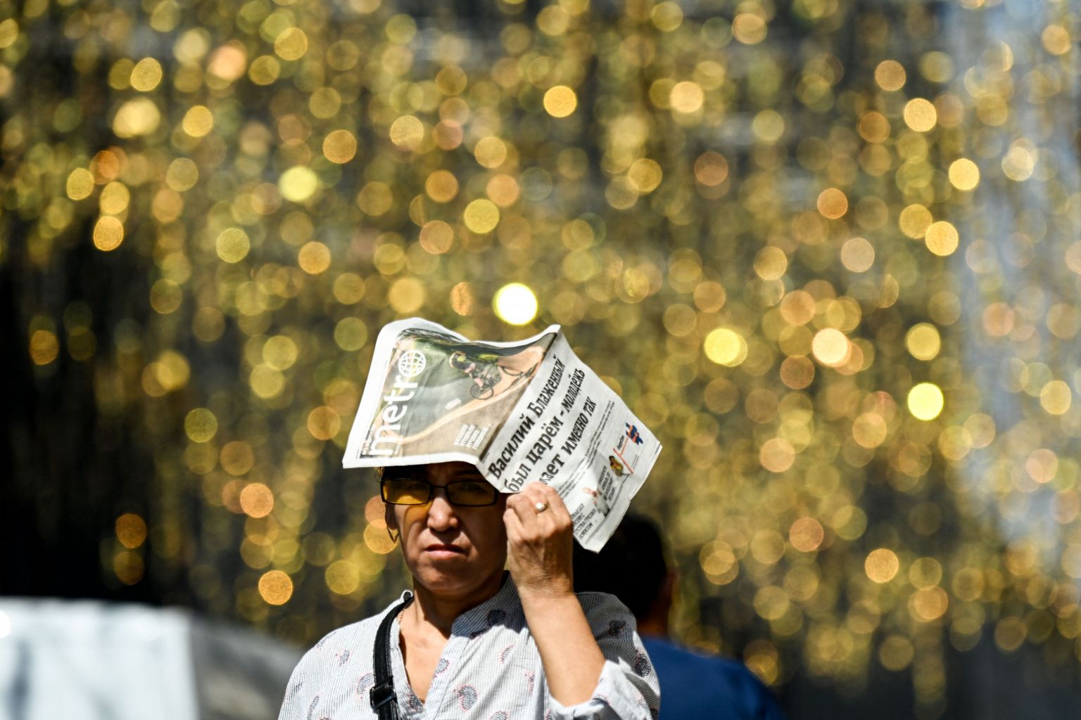A woman protects herself from the sun during a hot summer day in downtown Moscow on July 13, 2021.