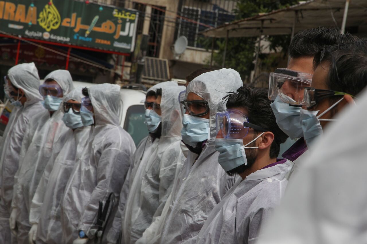 Members of the Syrian Violet NGO prepare to disinfect the Ibn Sina Hospital in Syria on March 19, 2020.