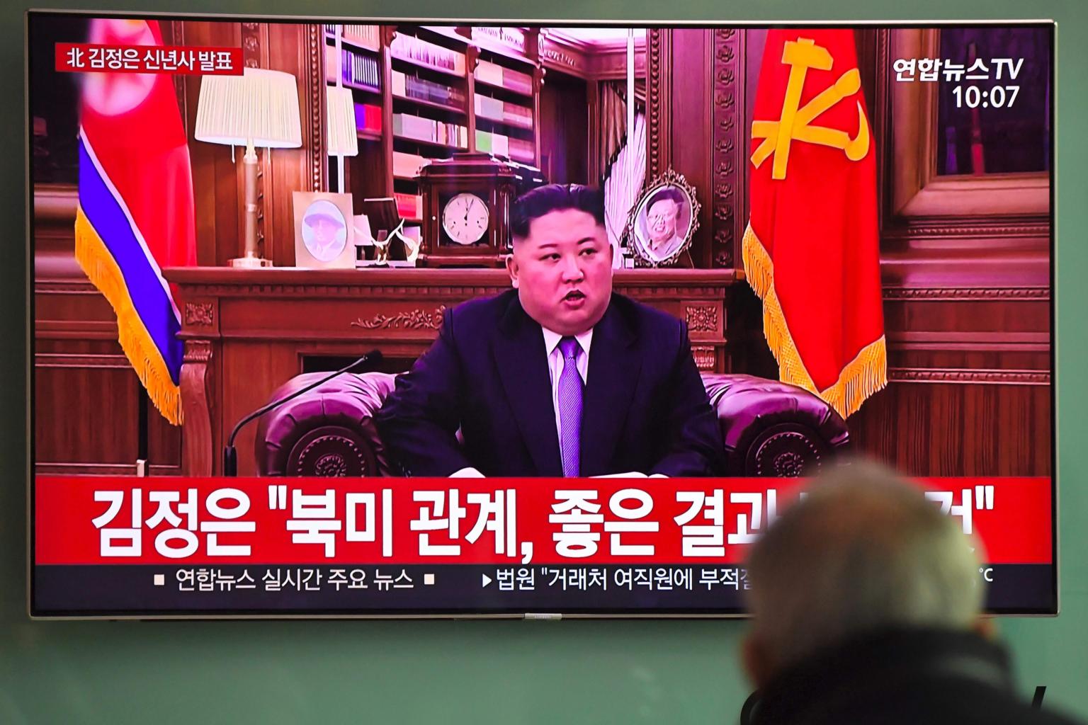 A man watches a television screen showing North Korean leader Kim Jong Un's speech at a railway station in Seoul, on Jan 1, 2019.