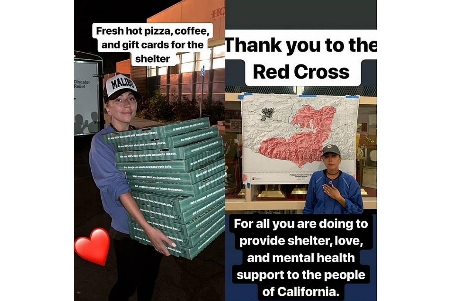 Gaga later posted a picture of herself - without her usual heavy make-up and coiffed hair - carrying a stack of pizza boxes on Instagram, with the accompanying text: "Fresh hot pizza, coffee, and gift cards for the shelter."