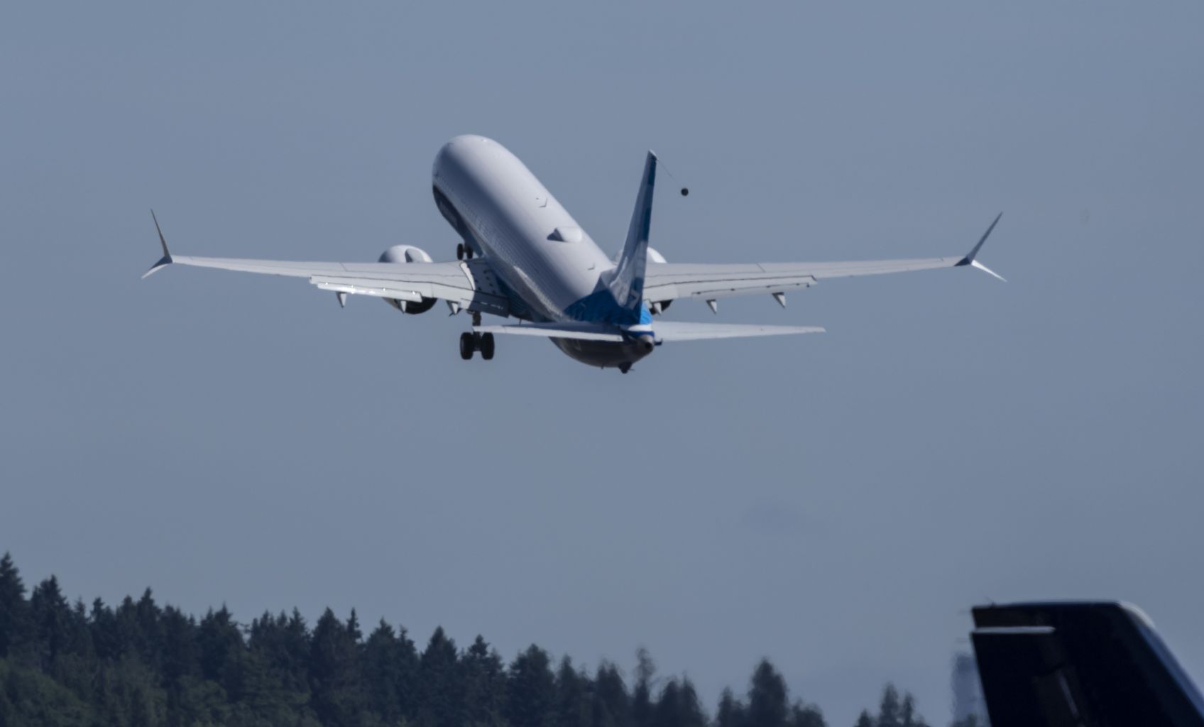 A Boeing 737 Max 10 airliner takes off for its first flight.