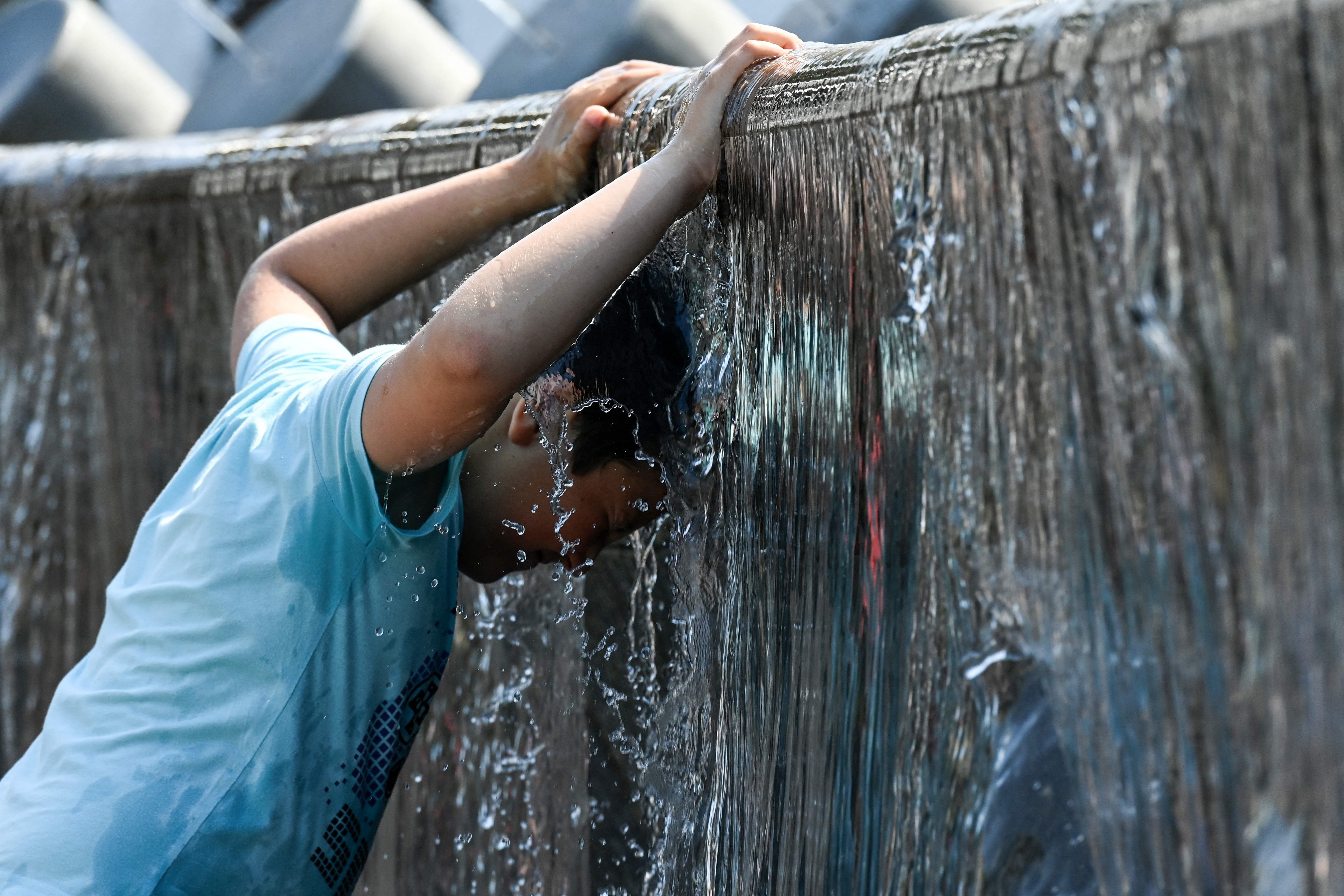 A boy cools off in a fountain during a hot summer day in downtown Moscow in 2021.