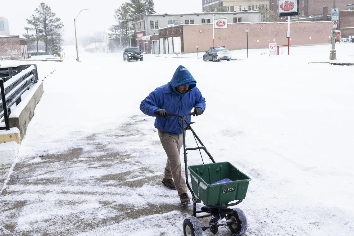 Moises Mata spreads salt along a sidewalk amid a winter storm in Memphis, Tennessee, on Jan 15.