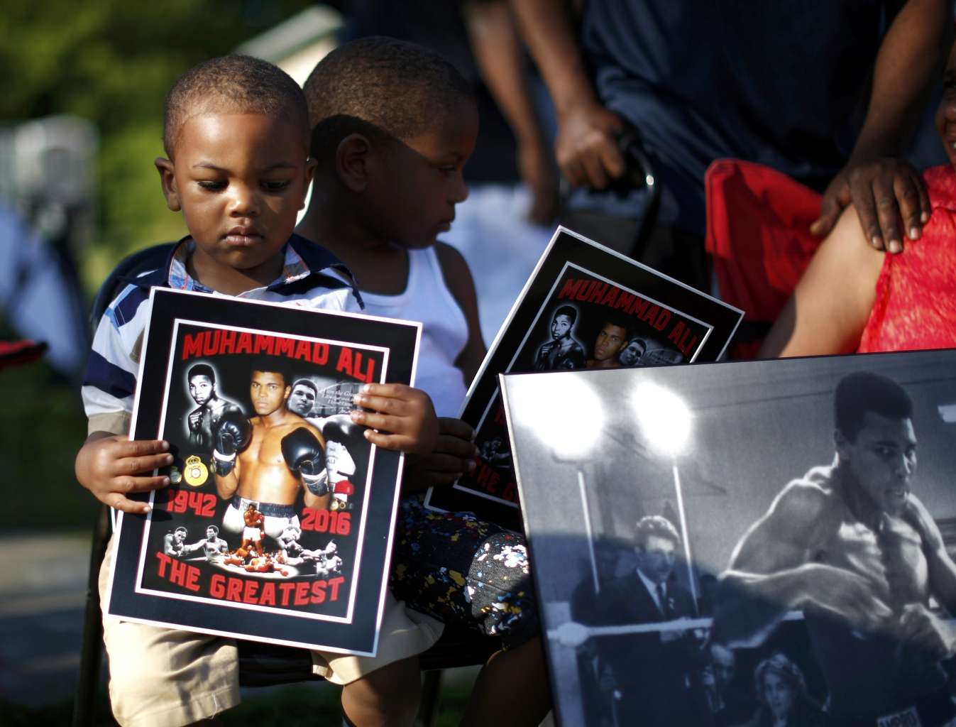 Brandon Liggons (left) holds an image of Muhammad Ali during the funeral procession for the three-time heavyweight boxing champion in Louisville, Kentucky, on June 10, 2016.