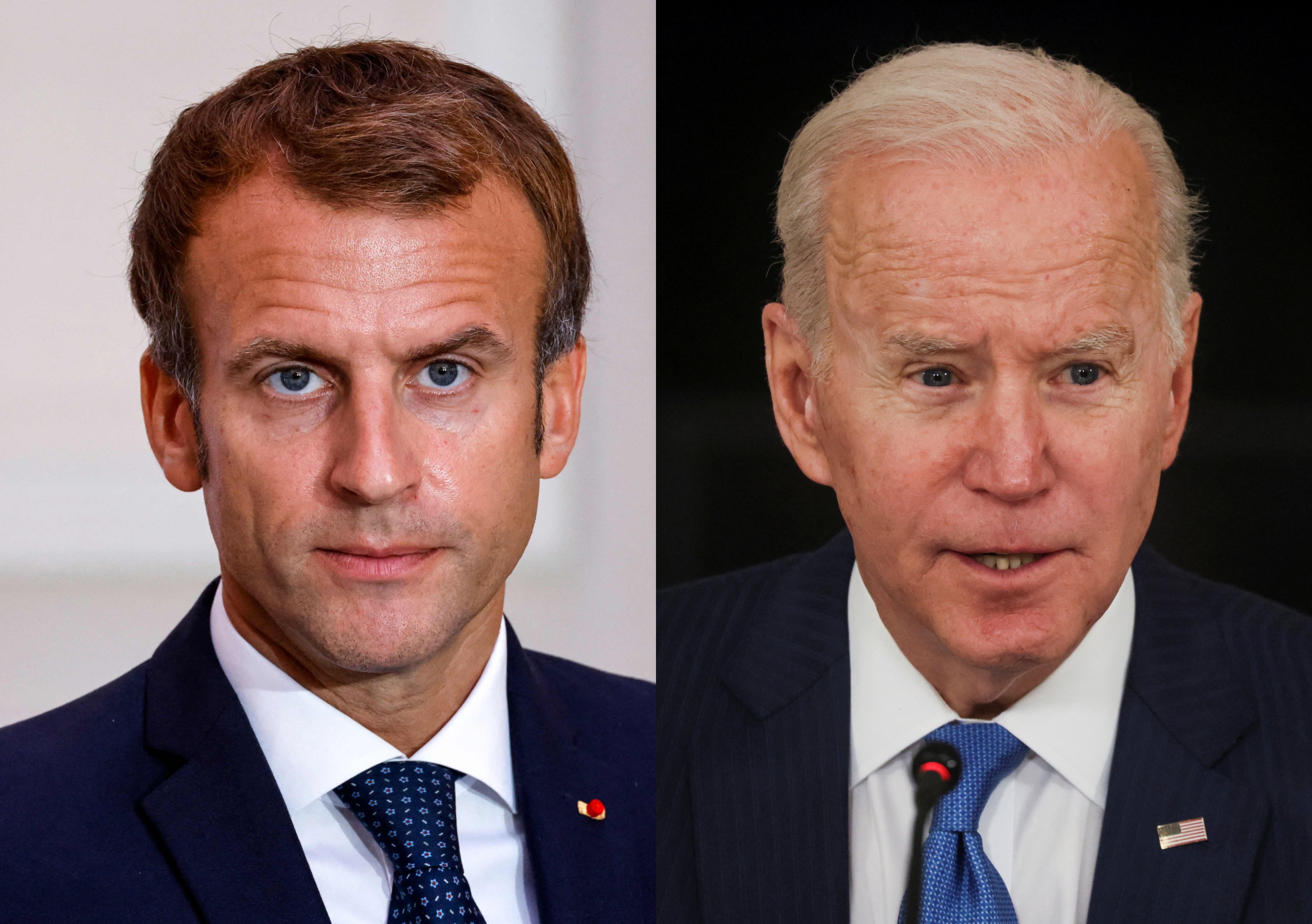 Macron (left) told Biden (right) about his meetings with Russian President Vladimir Putin and Ukrainian President Volodymyr Zelensky.