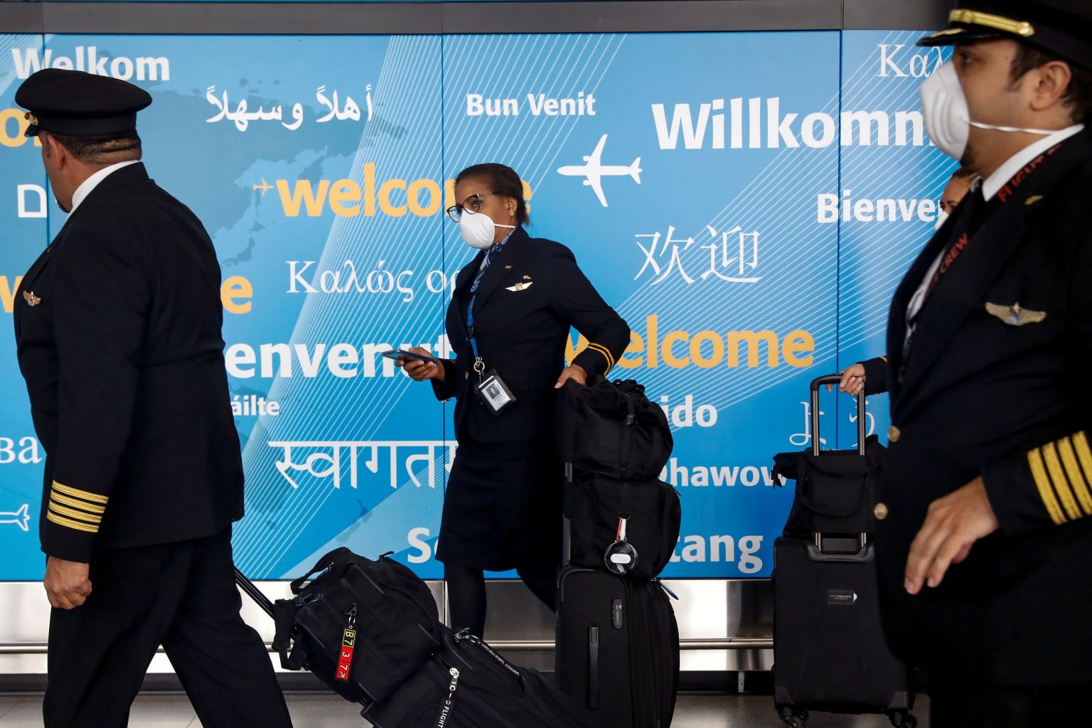 Members of a flight crew arrive at John F. Kennedy International Airport in New York City, March 20, 2020.
