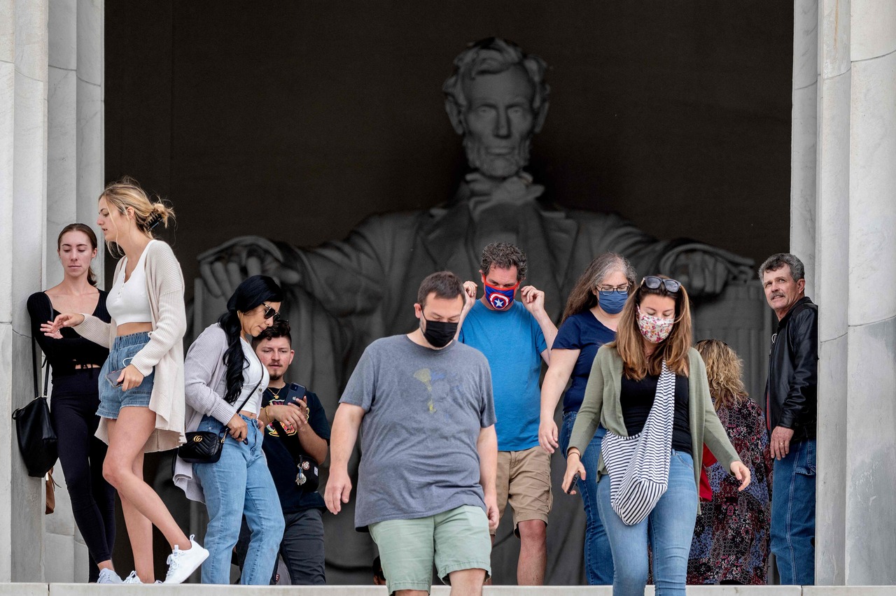 Tourists, some in face masks while others are not, visit the Lincoln Memorial in Washington DC, on May 14, 2021.