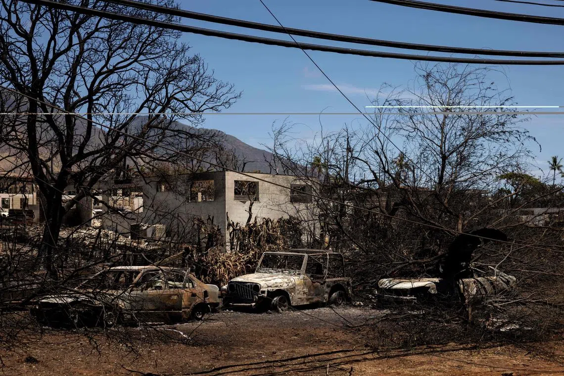 Destroyed buildings and cars seen in the aftermath of the wildfires in Lahaina, Maui, on Aug 17, 2023.