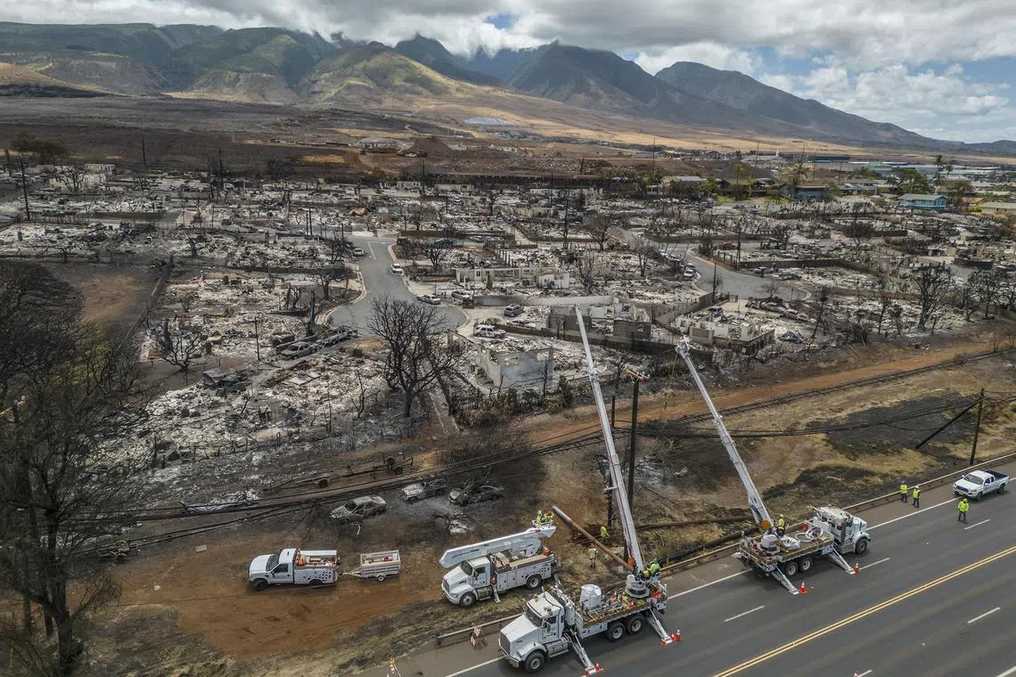 Hawaiian Electric crews working to repair damaged power lines in Lahaina, on the Hawaiian island of Maui, on Aug 16, 2023.