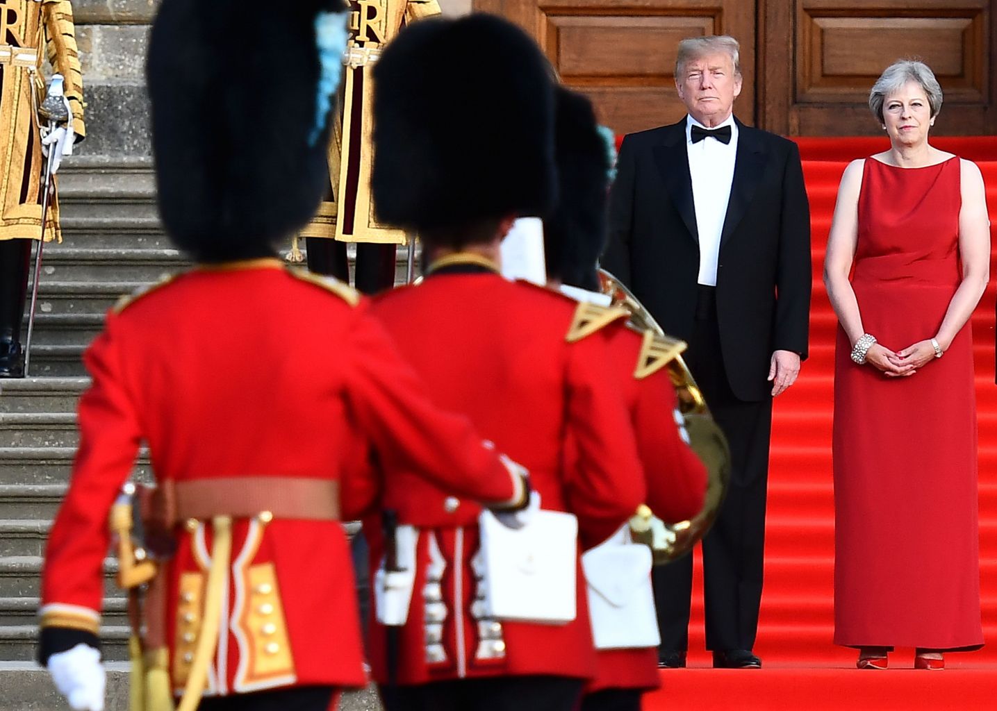 US President Donald Trump (left) and Britain's Prime Minister Theresa May stand on steps in the Great Court as the bands of the Scots, Irish and Welsh Guards perform a ceremonial welcome as they arrive for a black-tie dinner with business leaders at Blenheim Palace, west of London, on July 12, 2018.