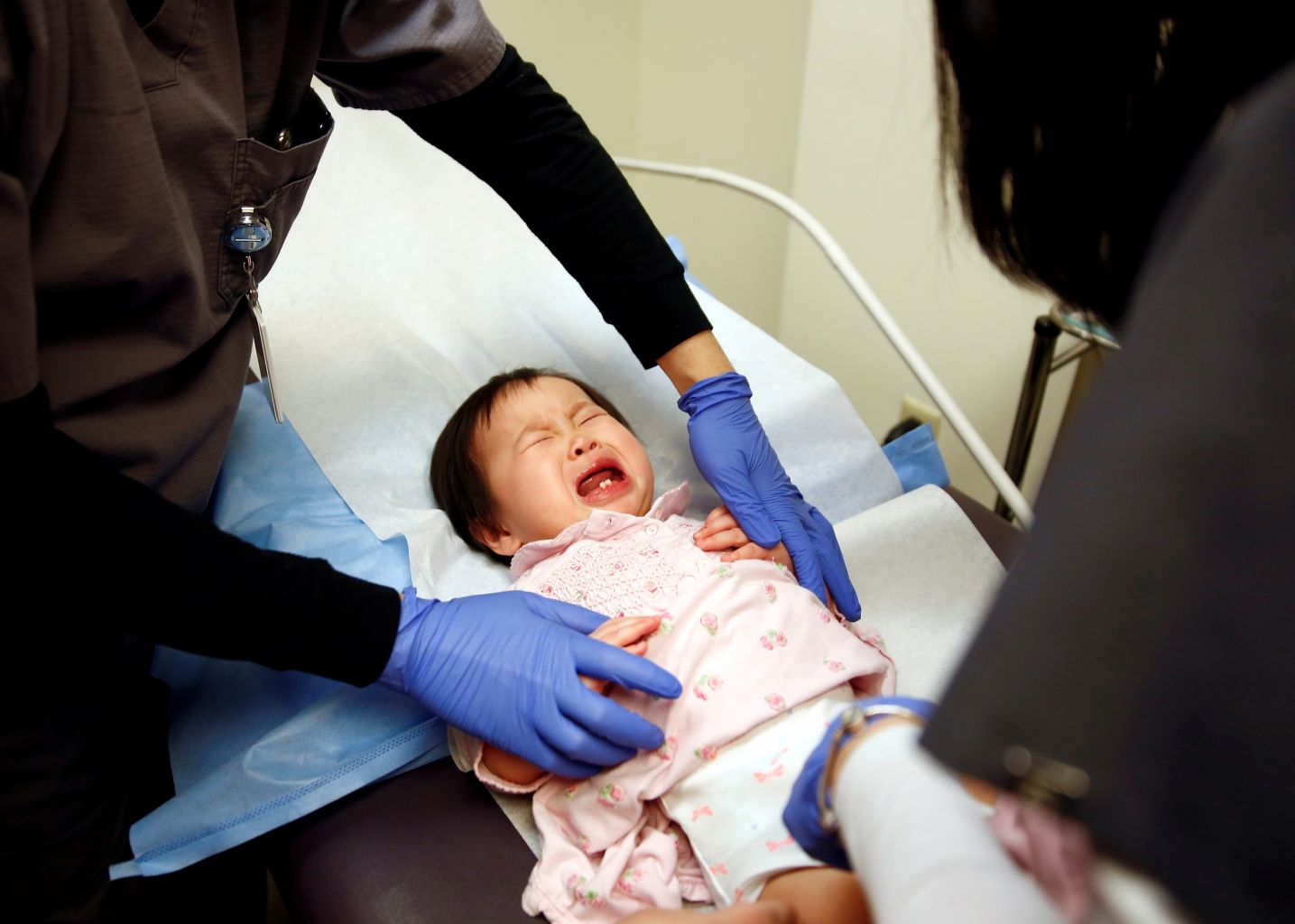 In a March 2019 file photo, one-year-old Bella Huang cries as medical assistants secure her legs for a series of vaccines in the US.
