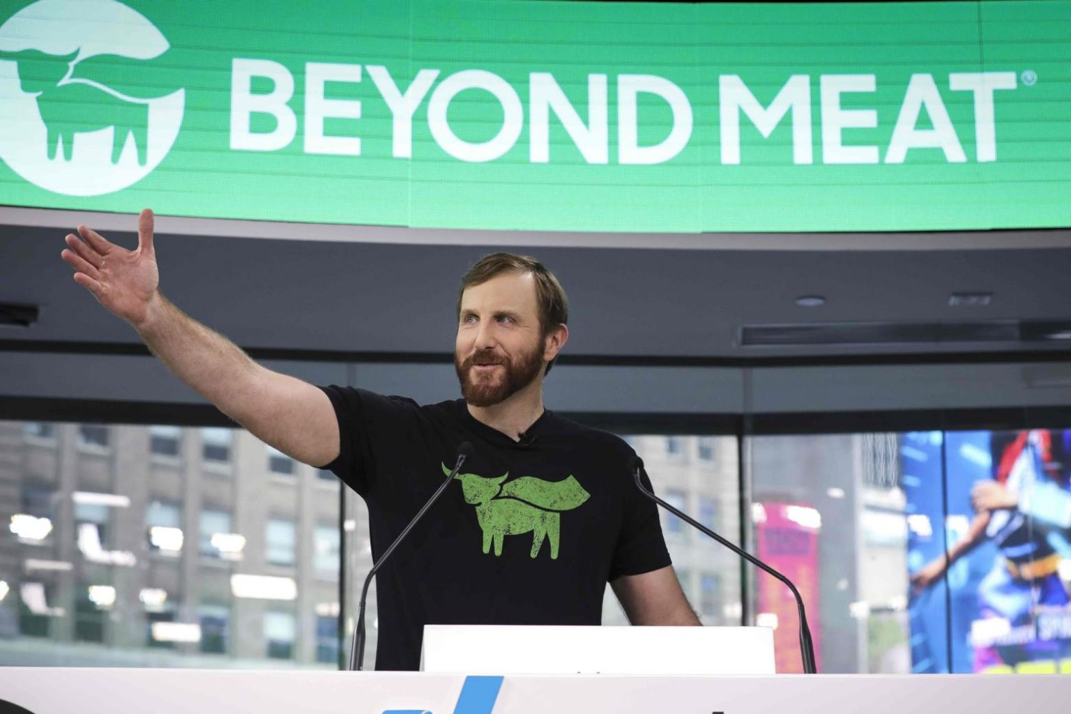 Beyond Meat CEO Ethan Brown speaks before ringing the opening bell at Nasdaq MarketSite in New York City on May 2, 2019.