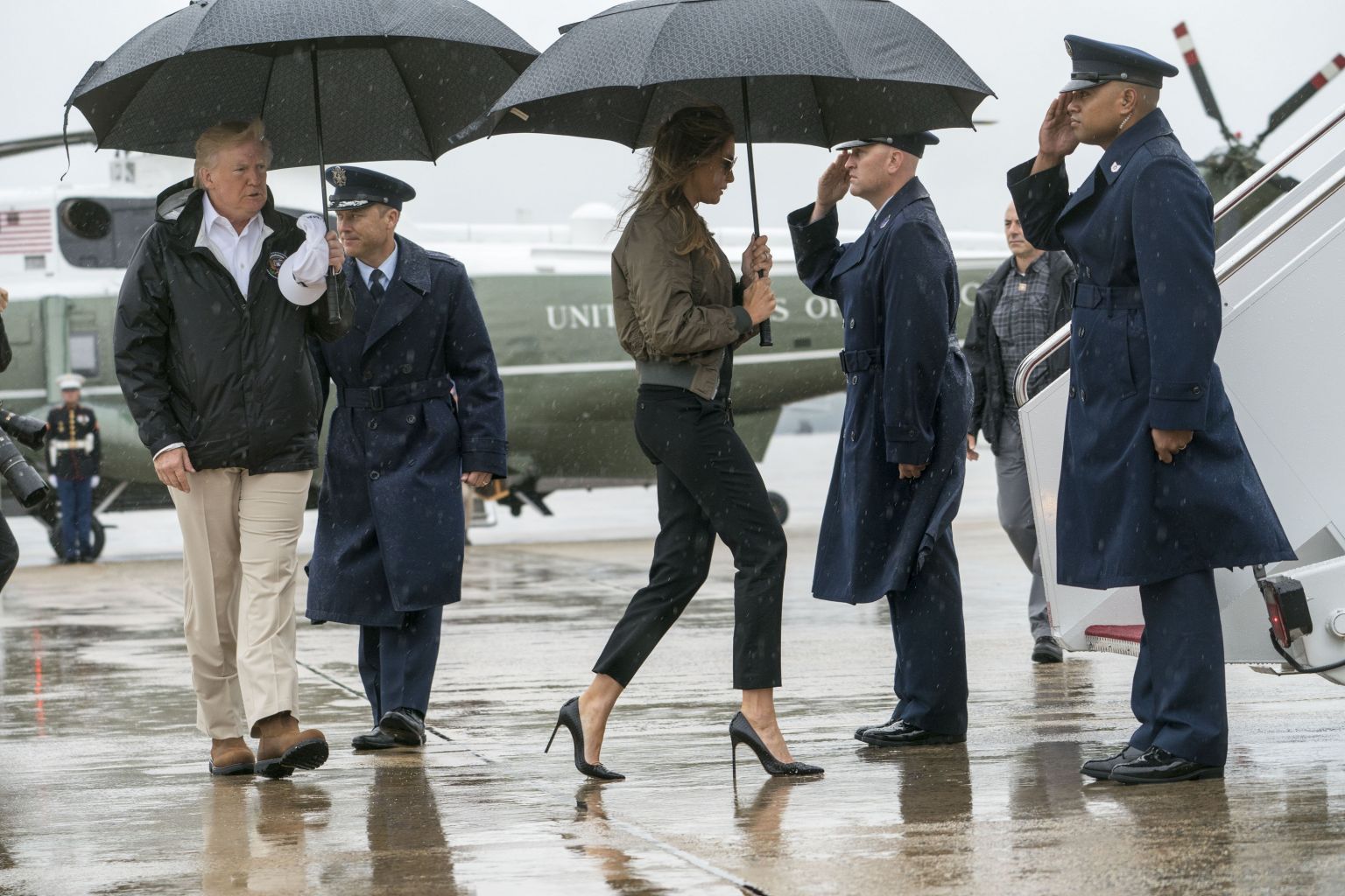 However, by the time the plane had landed, Melania Trump sported a more storm-appropriate outfit: white sneakers and crisp white shirt, with a ponytail pulled through a black baseball cap emblazoned with the word "FLOTUS".