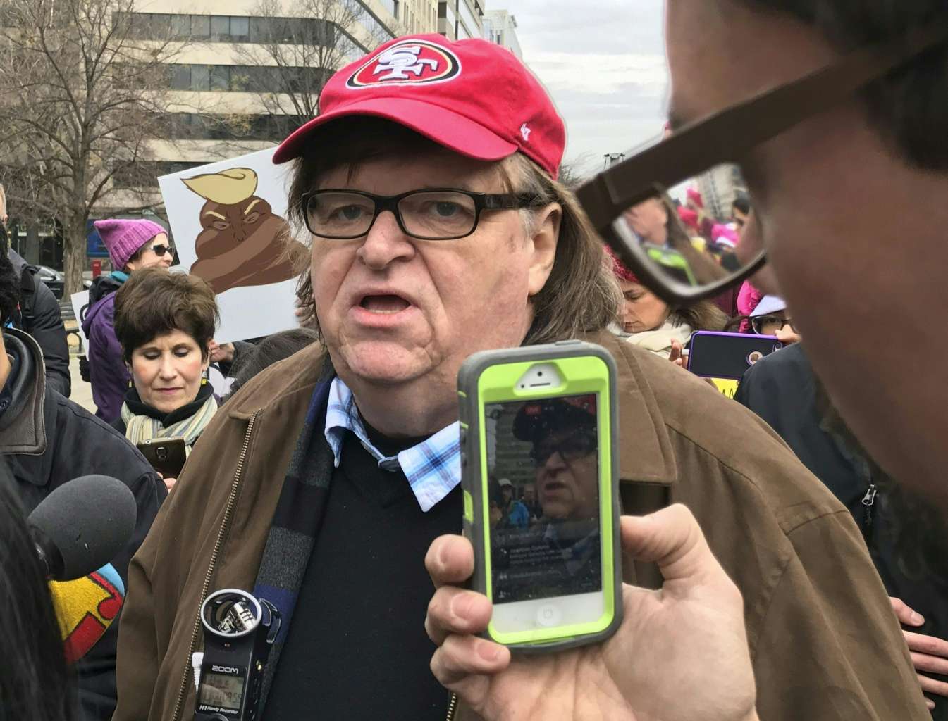 Michael Moore speaking to reporters during an anti-Trump protest in downtown Washington, DC in January.