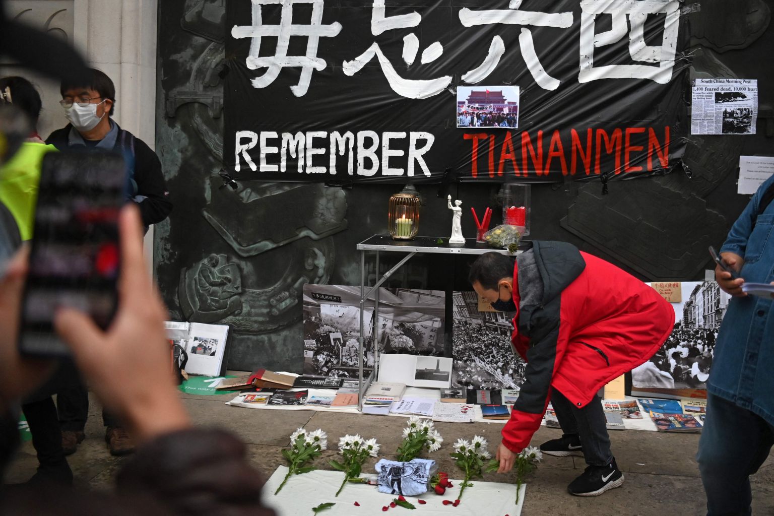People leave flowers during a vigil outside the Chinese Embassy in London on June 4, 2021, to mark the 32nd anniversary of the 1989 Tiananmen Square crackdown in Beijing, China.