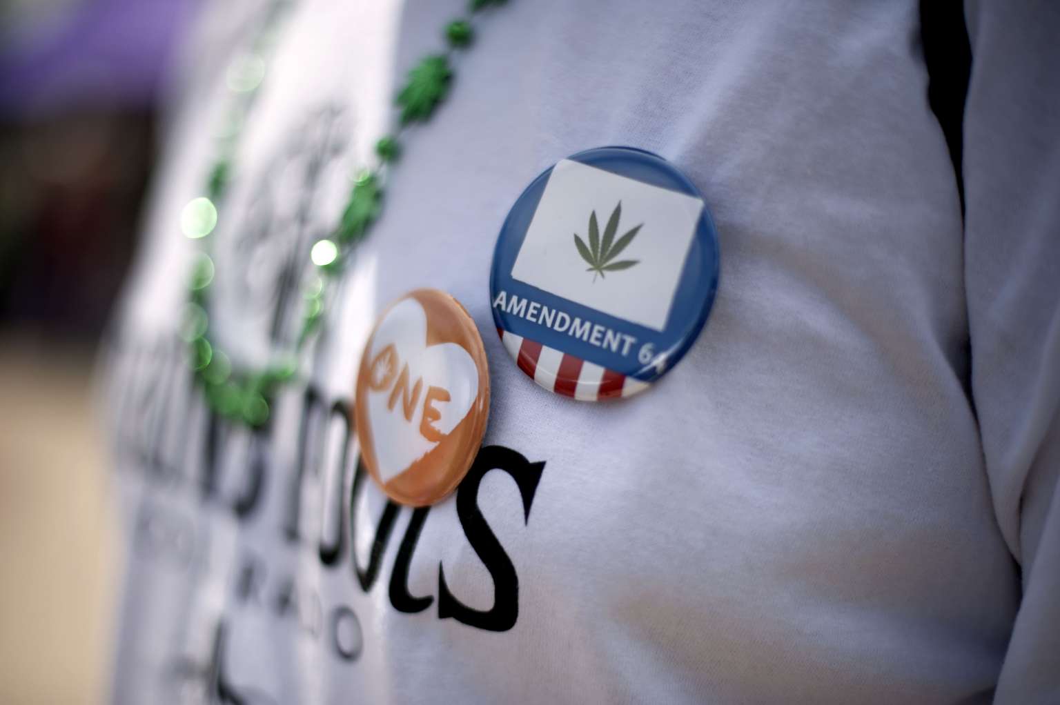 Pro-marijuana buttons worn during a celebration of the legalisation of cannabis and cannabis culture in Denver, Coloroado, on May 21.