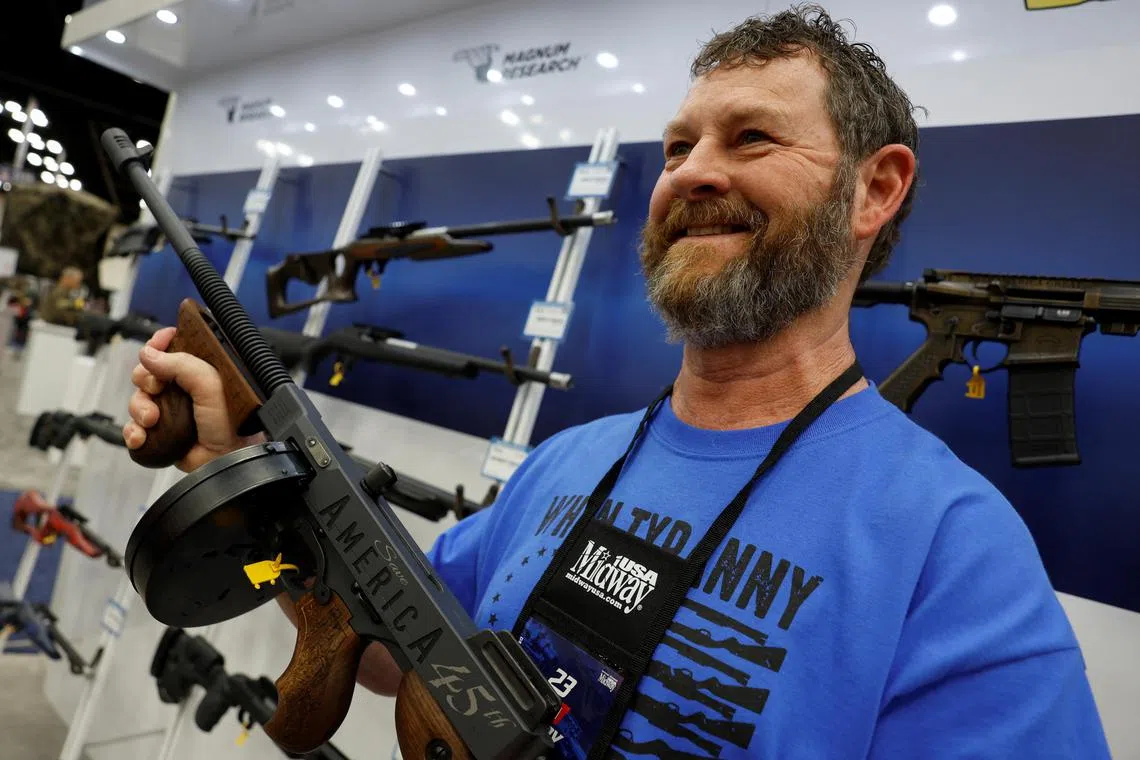A man holds a “Trump Save America” submachine gun, at the National Rifle Association annual convention.