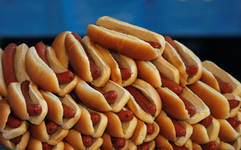 Hot dogs are displayed for the Nathan's Famous Fourth of July International Hot Dog Eating Contest during the weigh-in ceremony in Brooklyn, New York City.
