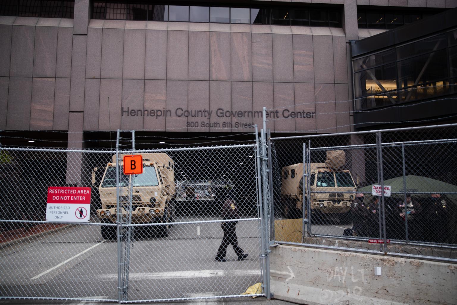 Minneapolis and state officials have heightened security precautions, girding the courthouse tower with barbed wire and armed soldiers from the National Guard.