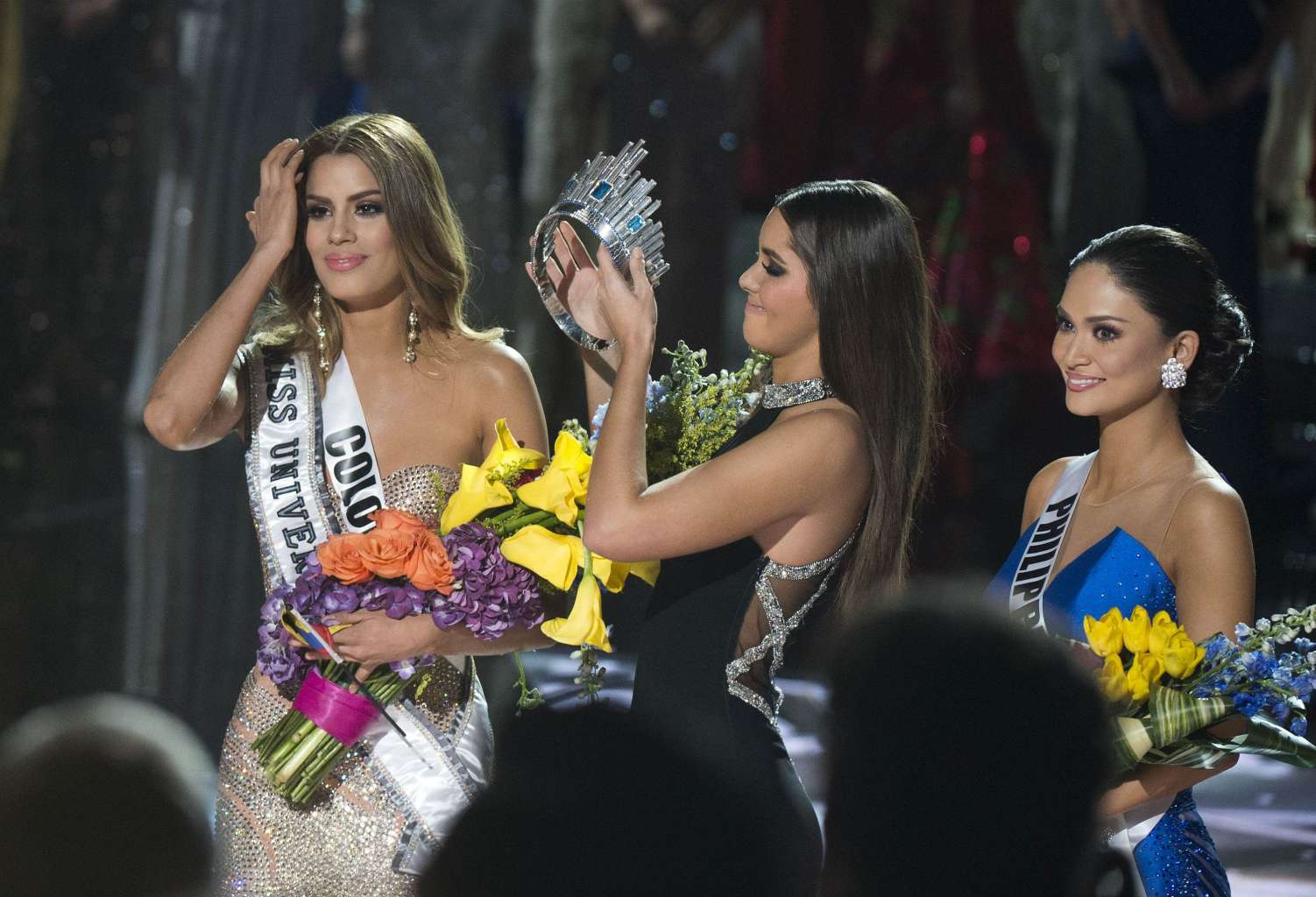 Miss Universe 2014 Paulina Vegas (centre) transfers the crown to winner Miss Philippines Pia Alonzo Wurtzbach (right) from Miss Colombia Ariadna Gutierrez.