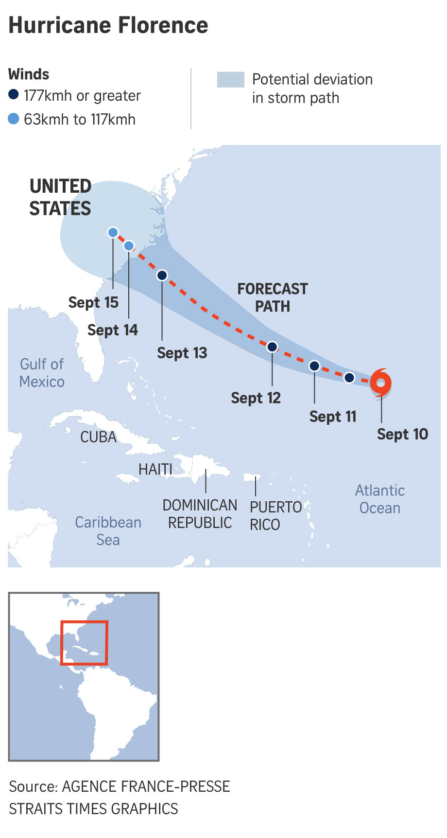 Winds and massive waves will pound coastal North and South Carolina when Florence makes landfall on Friday, and its rains will take a heavy toll for miles inland, the National Hurricane Centre (NHC) warned.