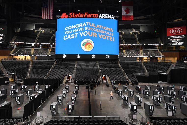 The State Farm Arena used as a polling place on the first day of early voting in the US Presidential election on Oct 12, 2020.