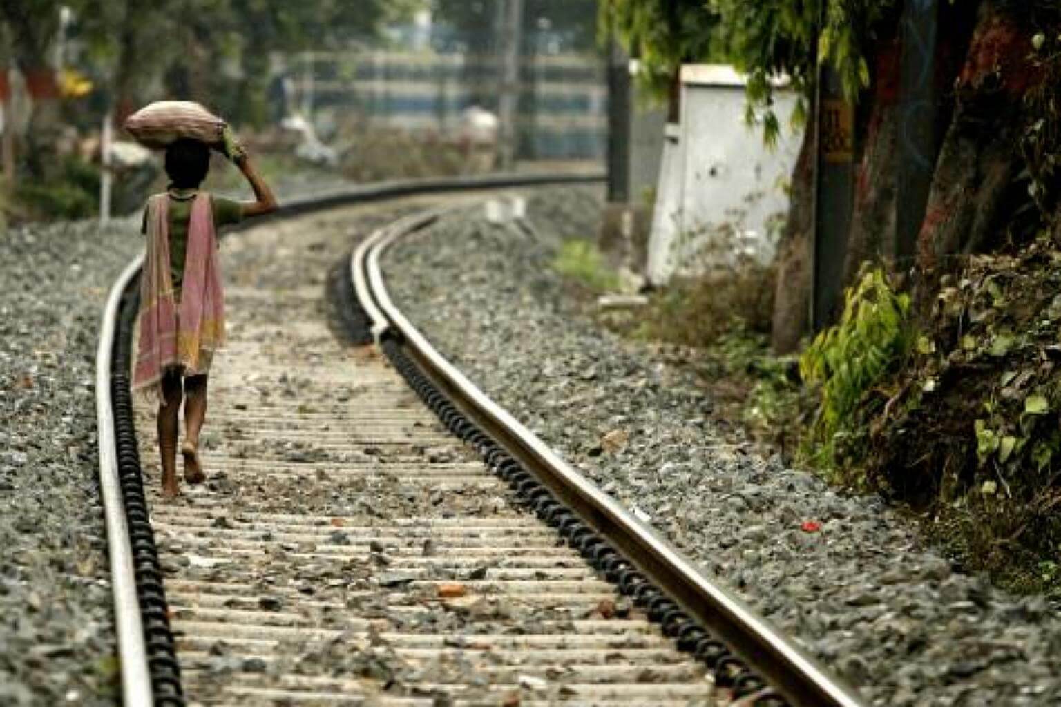 An Indian child labourer, returns home after finishing his field work, along a railway track close to Kolkata.