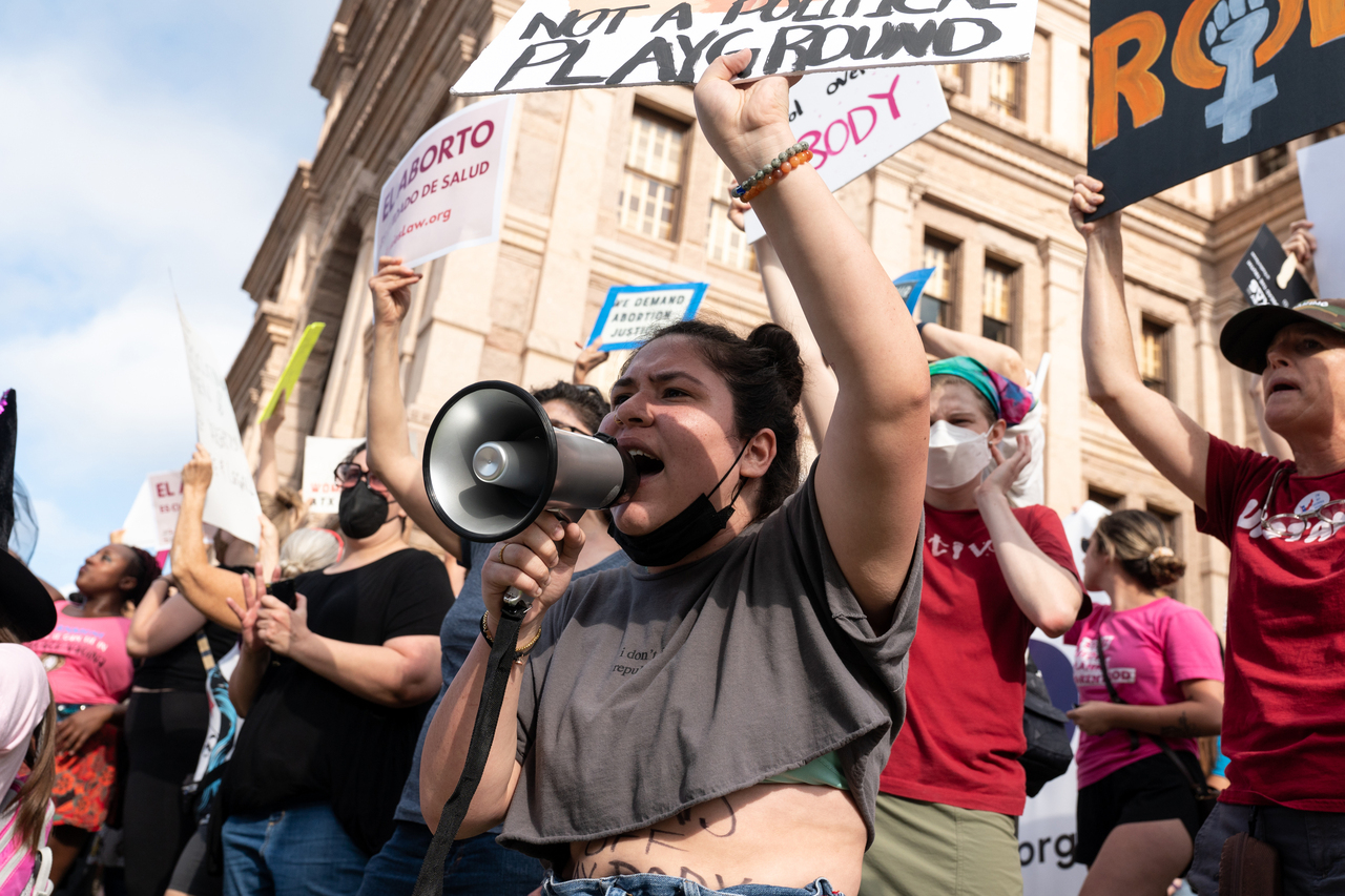 Demonstrators participate in a women's march for abortion rights outside the Texas state Capitol in Austin on Oct 2, 2021.