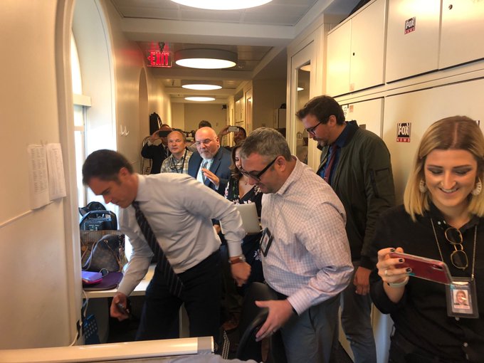 The rodent fell onto the lap of NBC News White House correspondent Peter Alexander about 10.45am, eventually seeking refuge amid a tangle of wires behind a shelf.