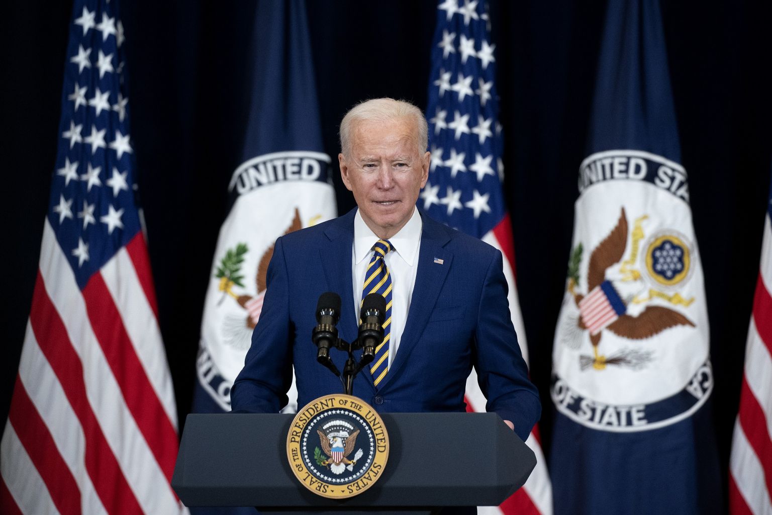 Joe Biden speaks to workers at the State Department in Washington on Feb 4, 2021,