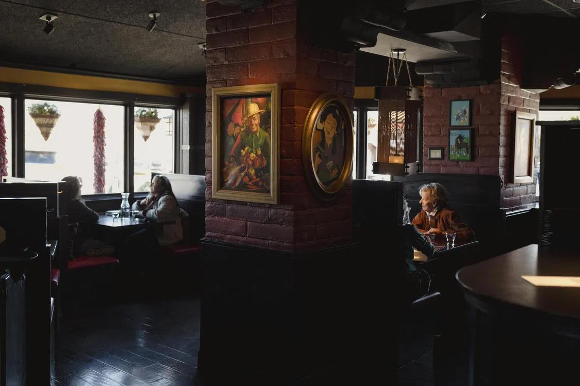 Oil paintings by Gene Hackman on the walls of Jinja Bar & Bistro in Santa Fe, New Mexico, on Feb 28.