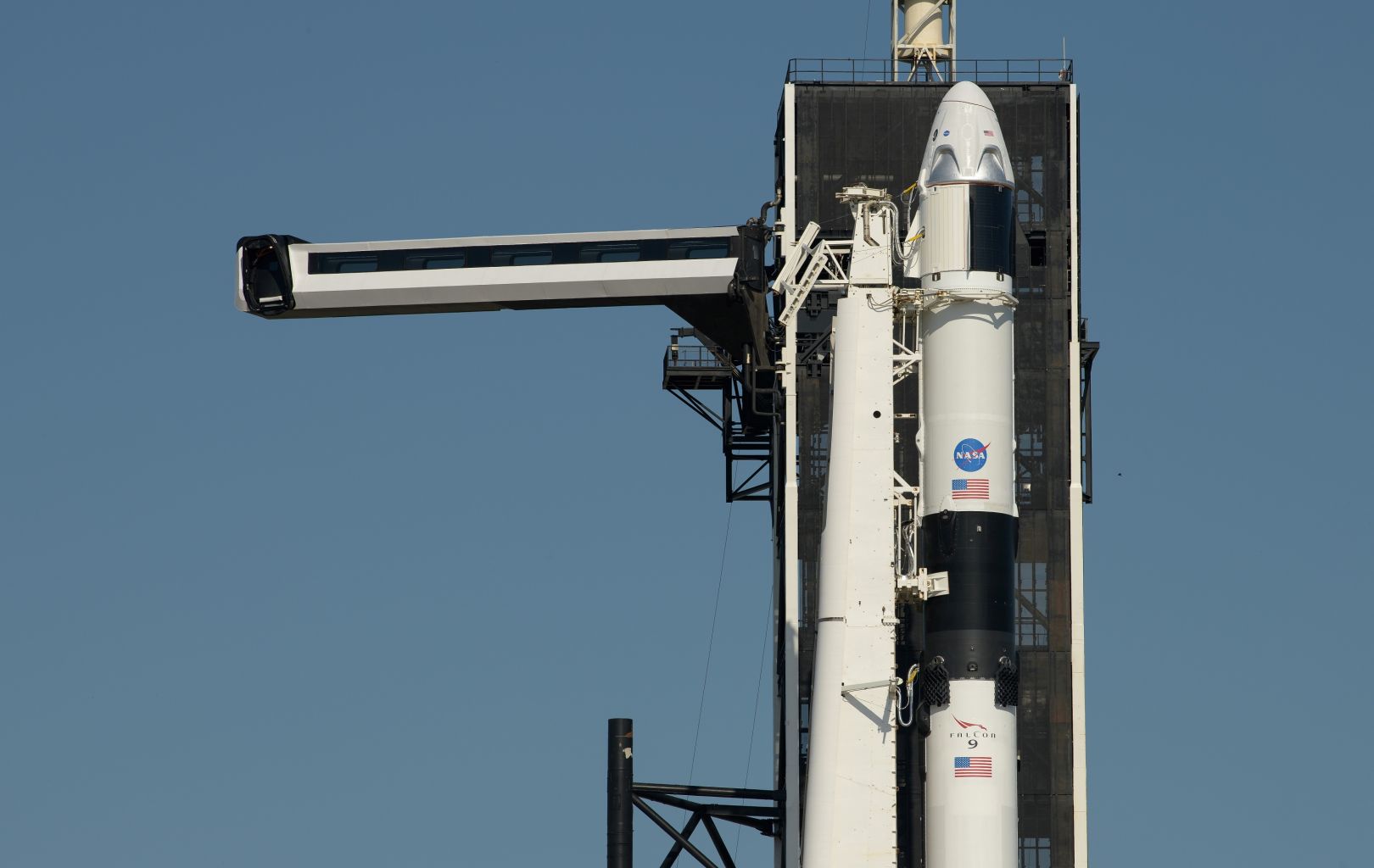 The crew access arm is swung into position to a SpaceX Falcon 9 rocket with the company's Crew Dragon spacecraft onboard.