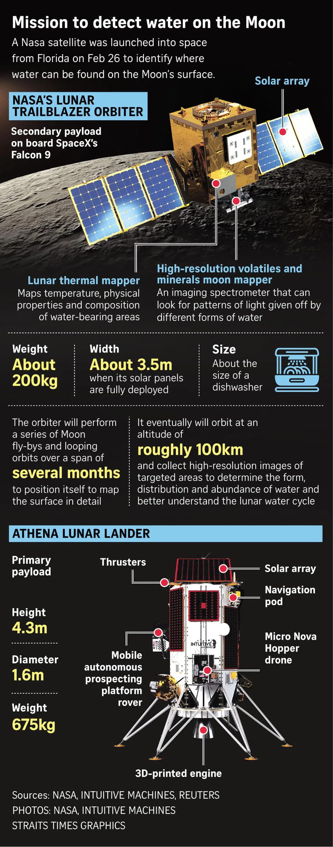 CAPE CANAVERAL, Florida - A dishwasher-size Nasa satellite was launched into space from Florida on Feb 26 to identify where water – a precious resource for lunar missions – can be found on the Moon’s surface, in places such as the permanently shadowed craters at its poles.