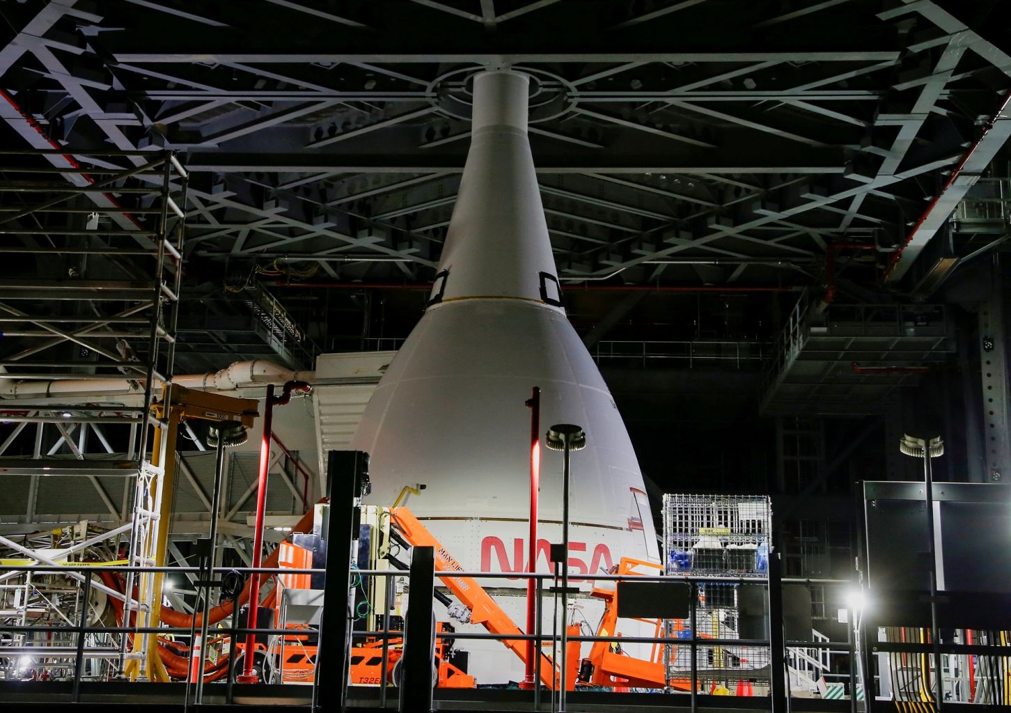 The Orion crew capsule of Nasa's Artemis programme is shown inside the massive Vehicle Assembly Building at Kennedy Space Centre.
