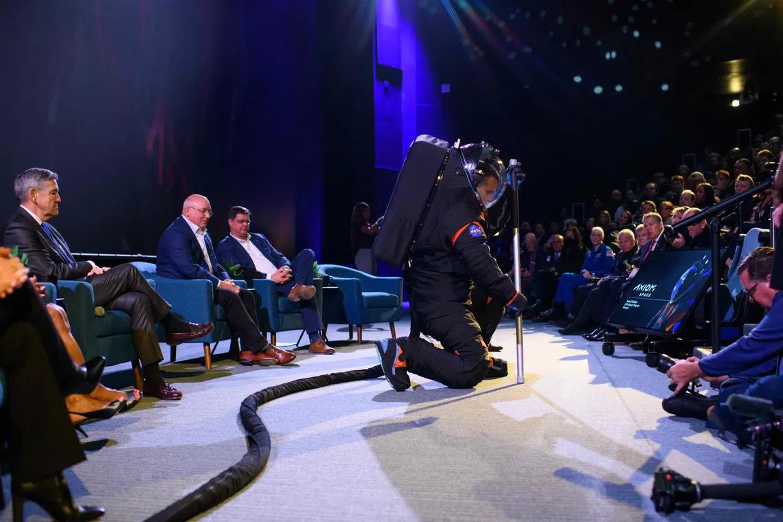 Chief Engineer Jim Stein shows the mobility of the new spacesuit during the Axiom Space Artemis III Lunar Spacesuit event.