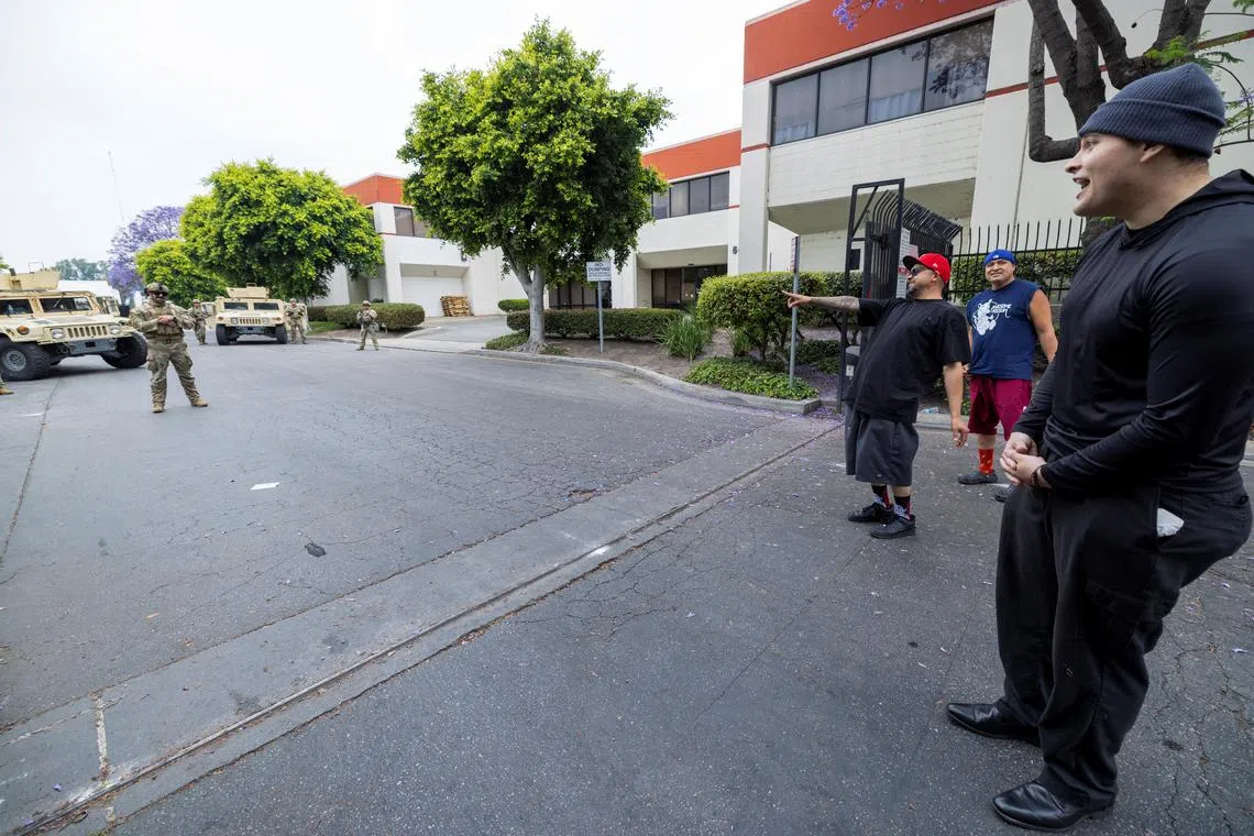 Residents heckling members of the California National Guard on June 8 as they waited in the Paramount Business Centre carpark.