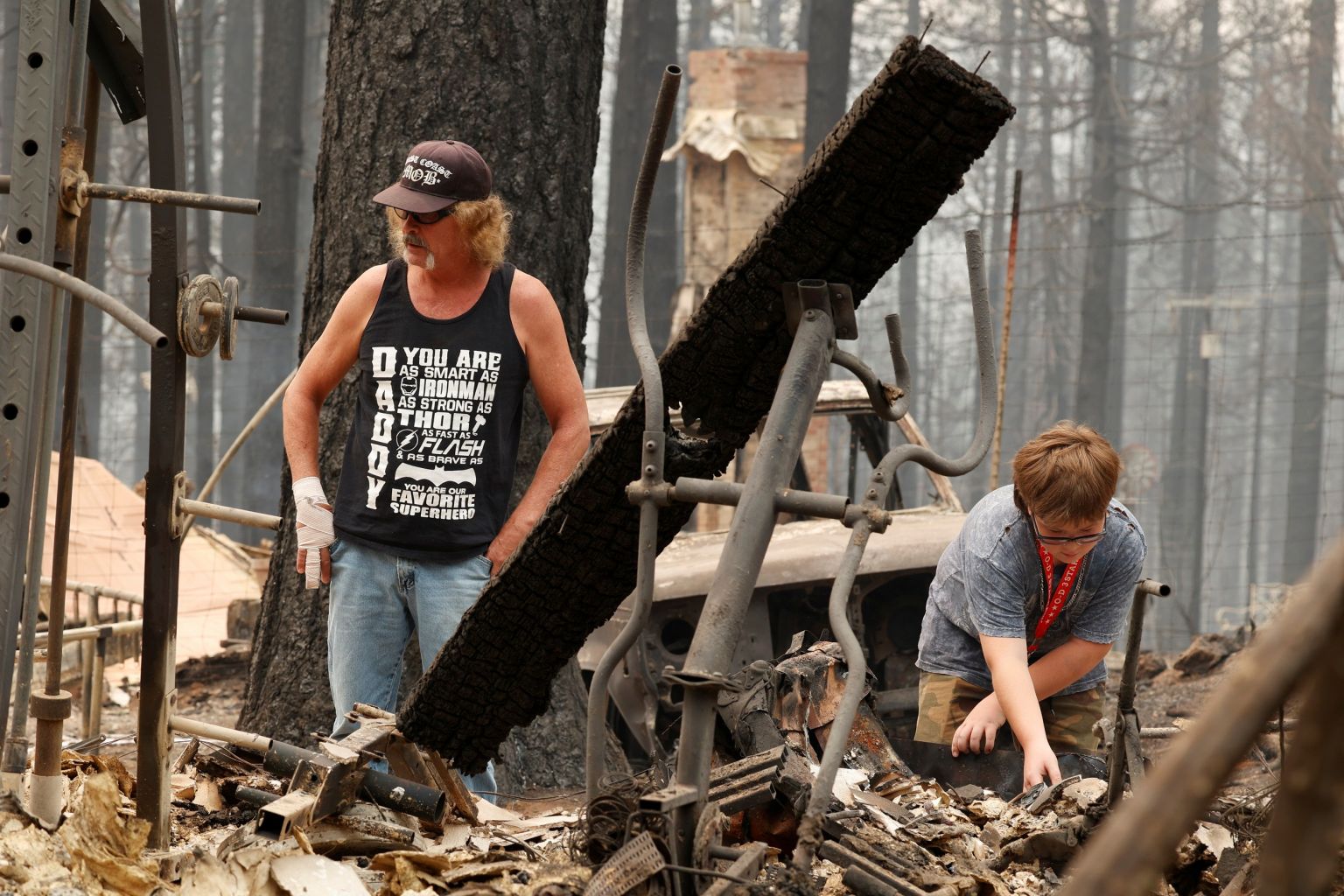 Fred Batten and his grandson Rocky Batten,11, look over the debris of their property after the Caldor Fire overran the El Dorado County town of Grizzly Flats, California.