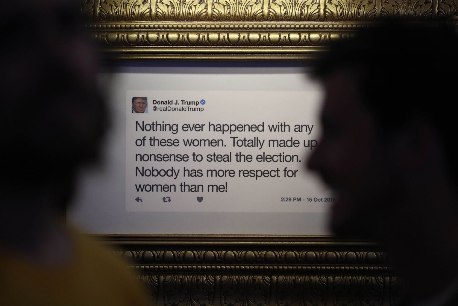 Patrons view exhibits at the opening of The Donald J. Trump Presidential Twitter Library in Washington.
