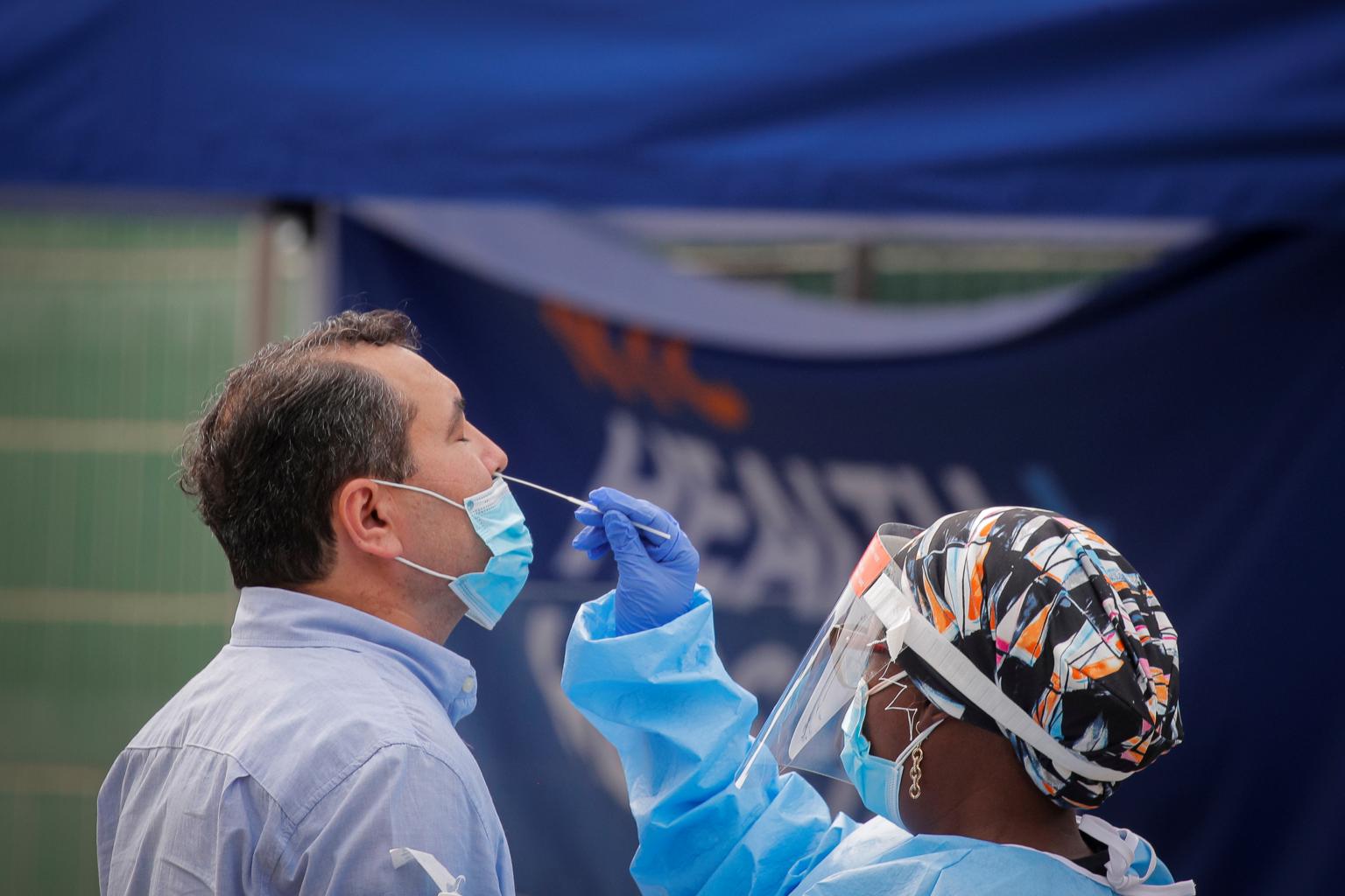 A health worker takes a swab sample from a man to test for Covid-19 in the Borough Park area of Brooklyn on Sept 25, 2020.