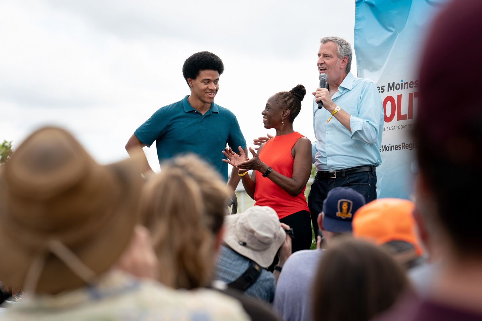 A 2019 photo shows New York City Mayor Bill de Blasio speaking at an event in Iowa, with wife Charlene McCray and his son, Dante.