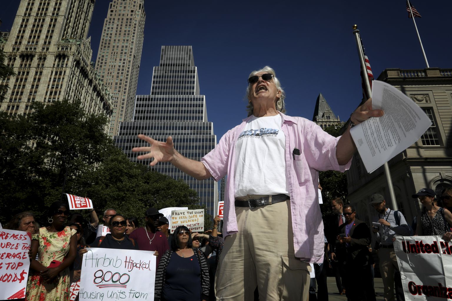 Mr Tom Cayler, 68, talking to a crowd of protesters rallying against Airbnb in front of City Hall in New York, on June 26, 2018.