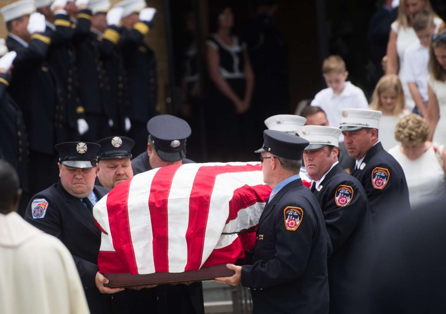 Pallbearers carrying the casket of Battalion Chief Lawrence Stack outside the Saints Philip and James Roman Catholic Church in New York on June 17.