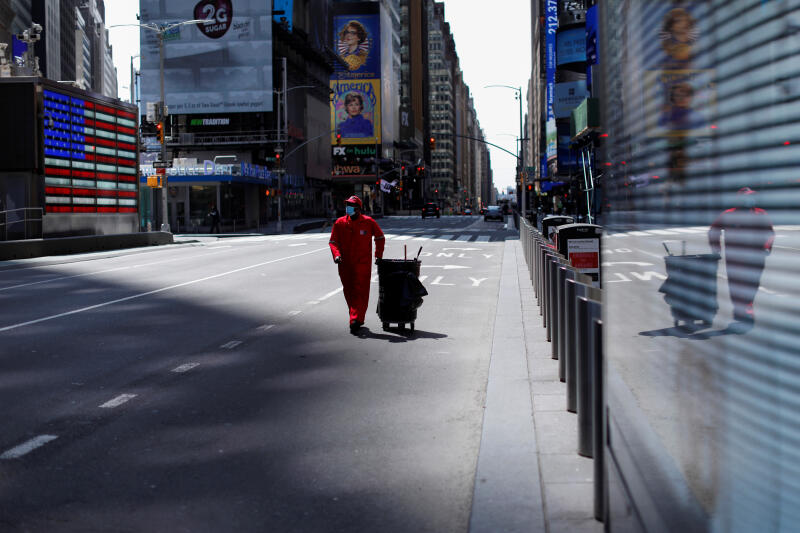 A worker walks though a nearly empty Times Square in New York City.