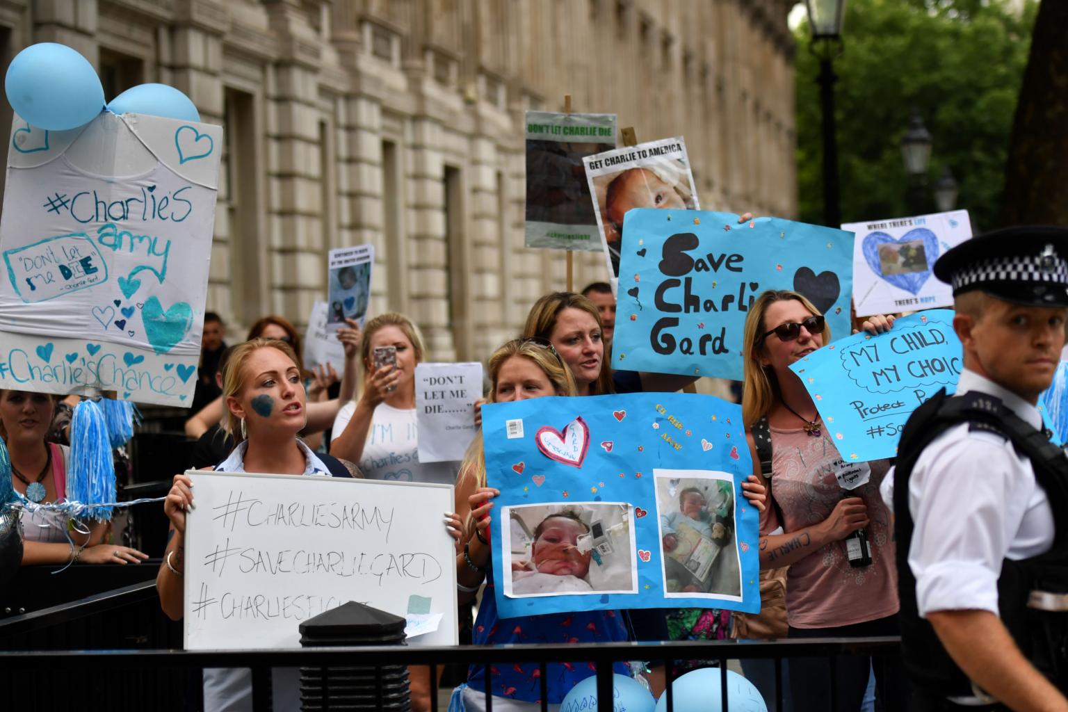 People gather in support of continued medical treatment for critically-ill 11-month old Charlie Gard in London.