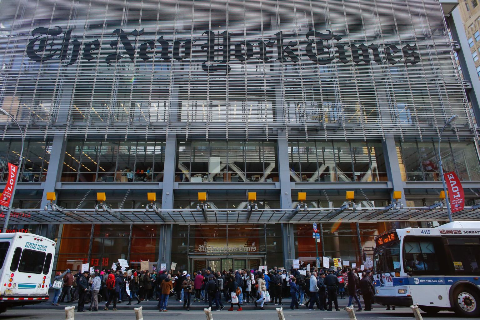 People taking part in a protest outside the New York Times in February 2018.