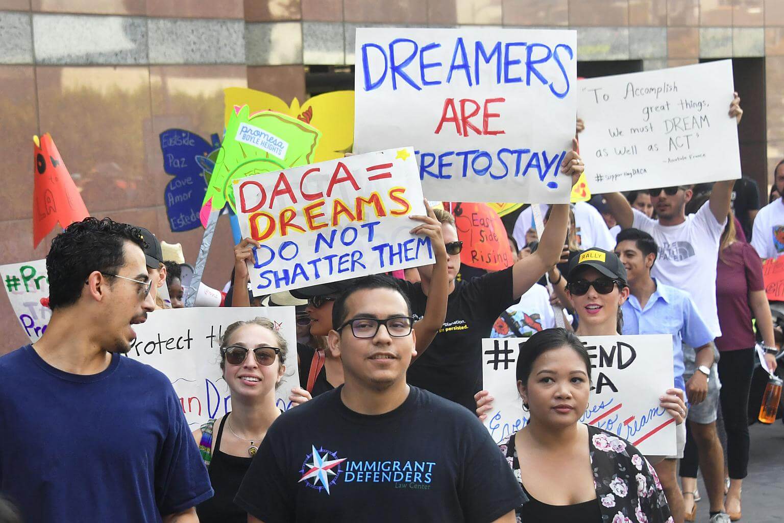 Young immigrants and supporters walk holding signs during a rally in support of Deferred Action for Childhood Arrivals (DACA) in Los Angeles on Sept 1, 2017.