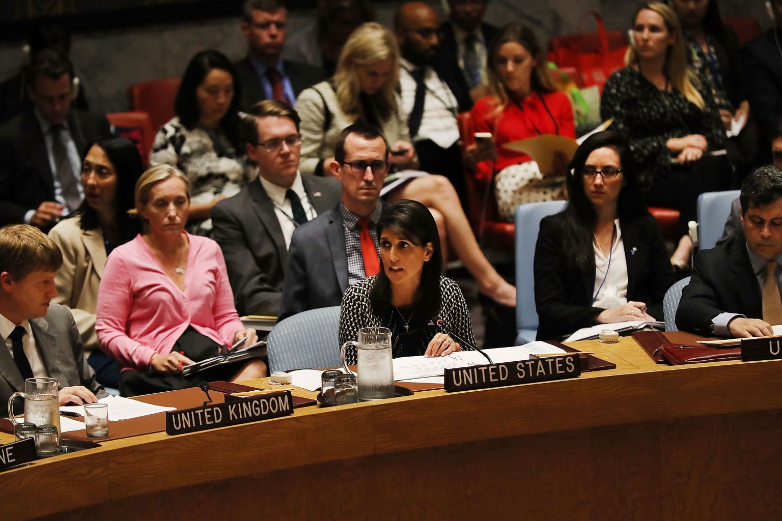 US Ambassador Nikki Haley addresses a UN Security Council meeting, Sept 28, 2017.
